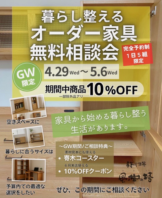 オーダー家具相談会のみGW期間限定・完全予約制となります。