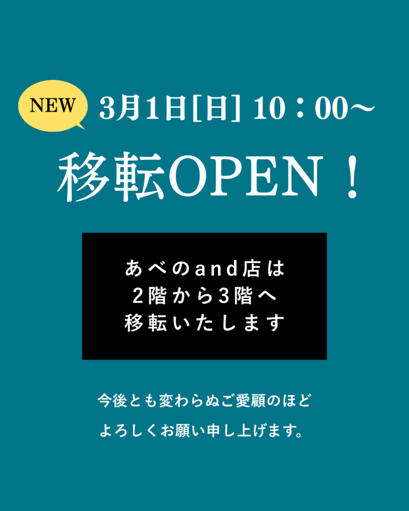 この度、あべのand店は新店舗に移転させていただくことになりました。