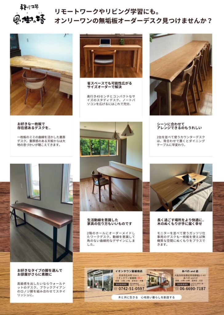 好評のプチ一枚板の新入荷や好きな木の種類でサイドオーダーできる製作幅ハギ天板も是非ご相談ください。
