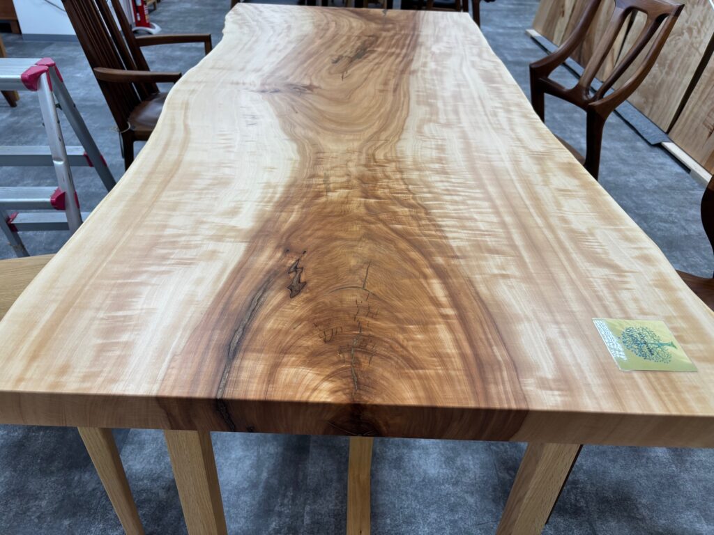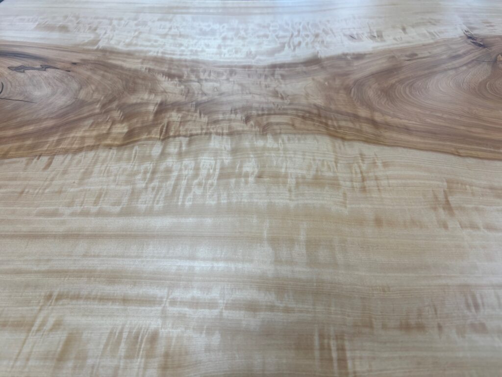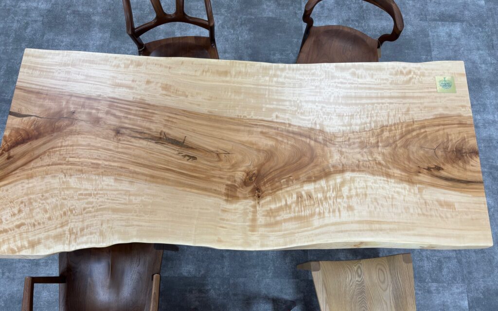 絹のような光沢と、流れるような杢目が美しいトチの一枚板が入荷いたしました。