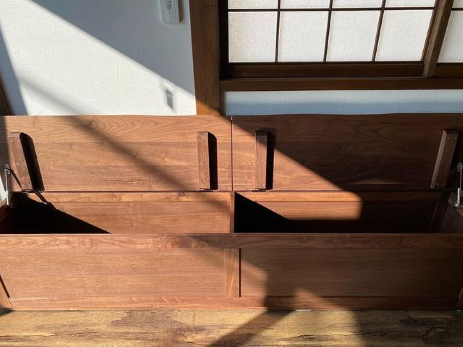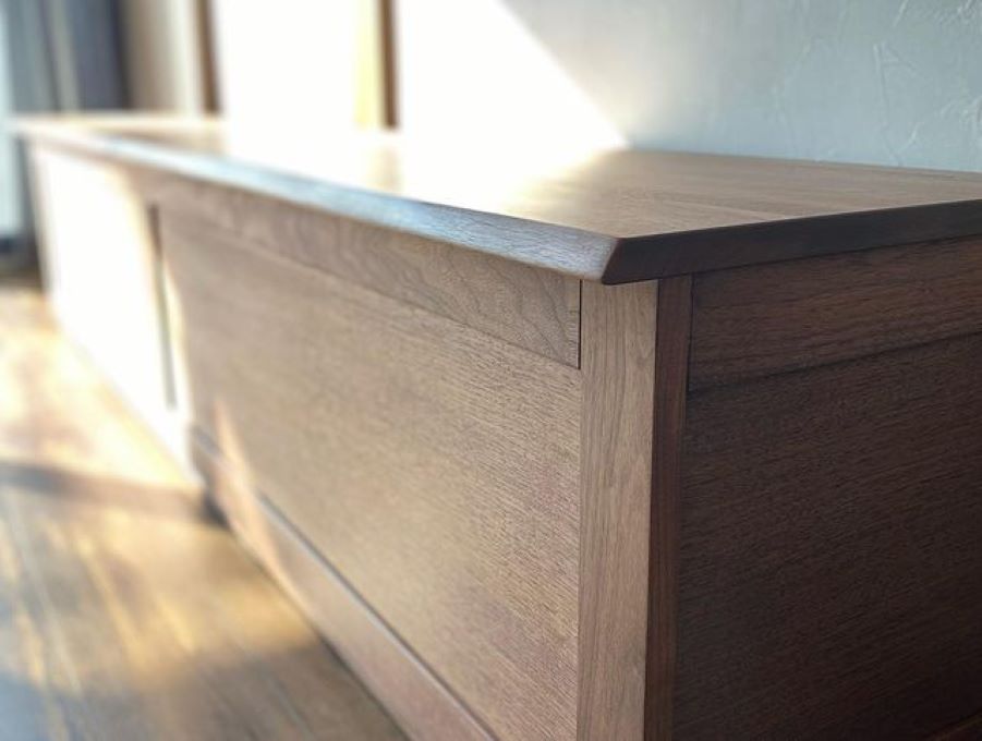 跳ね上げ扉にレコードをディスプレイ。よくあるタイプの家具と思いきや、オール無垢材で作られた当店のテレビボードは存在感が一味違います。扉のデザイン等、ディテール一つ一つに職人の丁寧な手仕事が表れています。