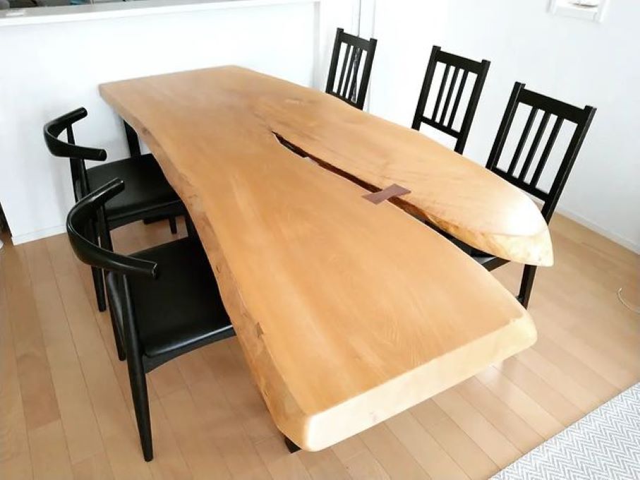 栗材で作ったシンプルなテレビボード。40ミリ厚の天板は存在感抜群。黒く塗装された、これまたシンプルな脚部。余計な味付けはいりません。