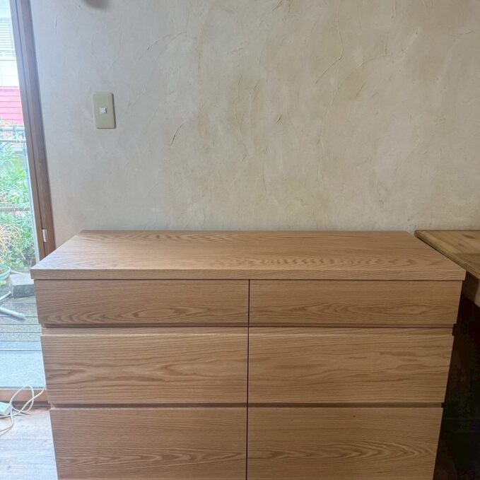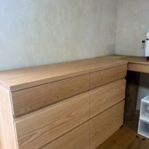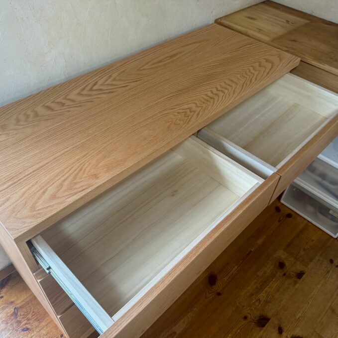 レッドオーク材の食器用シェルフをオーダー製作 お客様よりご依頼いただき、レッドオーク無垢材を使用した食器用シェルフを製作・納品いたしました。 横に大きく広がるデザインで、空間に圧迫感を与えず、ダイニングやキッチンまわりをすっきりと見せてくれる一台。 前面は装飾を抑えたフラットなデザインに仕上げ、レッドオークならではの力強く美しい木目が引き立つ佇まいになっています。 収納部は使い勝手を考えた大容量設計。 日常使いの食器はもちろん、カトラリーやクロス類なども整理しやすく、見た目の美しさと実用性を両立しています。 レッドオークは硬く耐久性に優れた木材で、使い込むほどに色味や風合いが深まっていくのも魅力。 長く使う家具として、経年変化も楽しんでいただけます。 空間の主役になりながらも、暮らしに自然と馴染むオーダーシェルフとなりました。