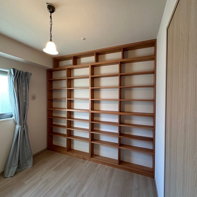 壁面書棚のご依頼があり、お客様と打ち合わせを重ねてながらお創りしました。 ブラックチェリー材がお部屋の雰囲気とマッチして素敵な空間になりました。