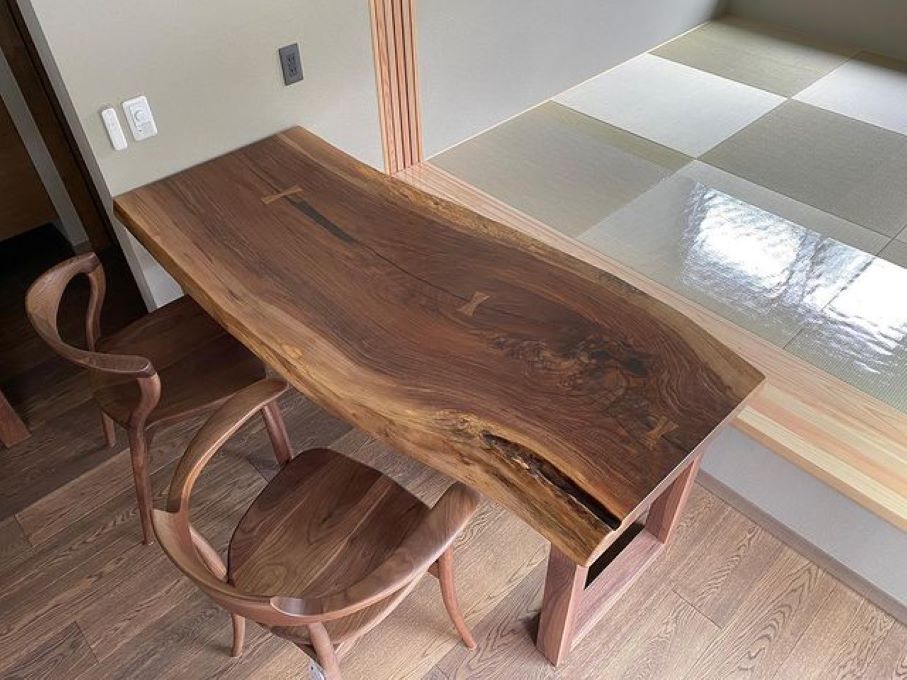 楠の一枚板ダイニングテーブルです。どんな場所でどんな育ち方をした木なんだろう。この想像力を掻き立てるフォルムがまさに一枚板の醍醐味です。