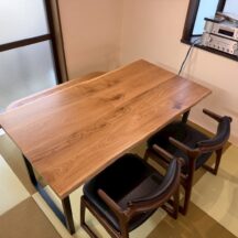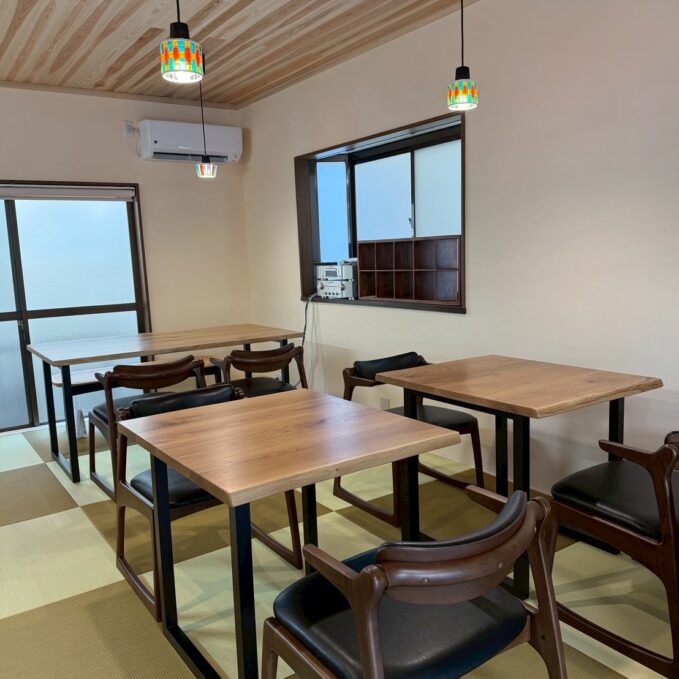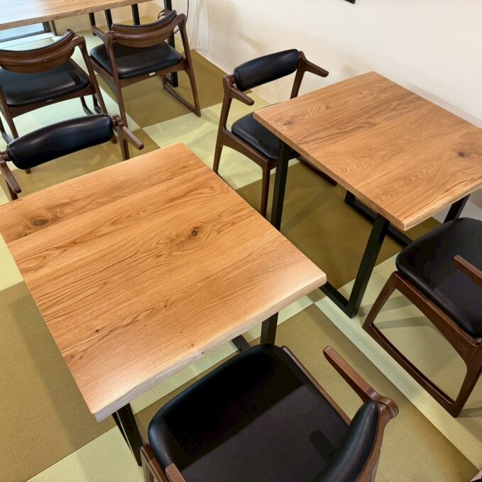これから始まるカフェの空間に ナラ材のテーブルとチェアをお届けしました。 天井の木目、やわらかな光、そして畳の落ち着き。 和の空気感に、ナラの力強くもやさしい表情がしっくりと馴染んでいます。 すっきりとした黒脚のテーブルと 深みのある木のチェア。 異素材の組み合わせが、空間をほどよく引き締めてくれました。 ここで過ごす時間が、 ゆっくりと流れる心地よいひとときになりますように。 オープンが楽しみです。