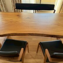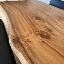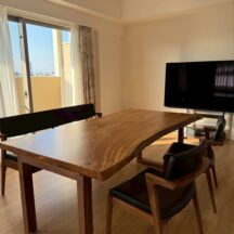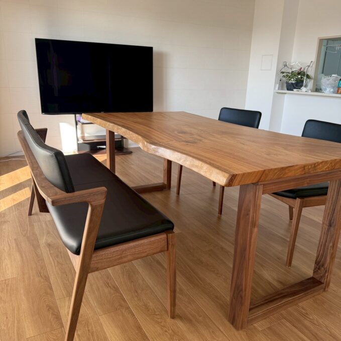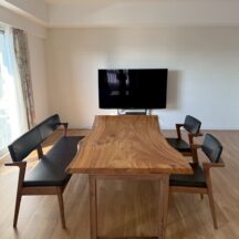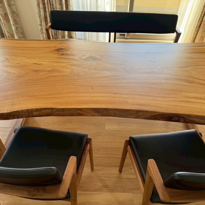 やさしく広がる木目と、自然がつくり出した伸びやかな耳。 存在感がありながらも、空間にすっと馴染むクスの一枚板ダイニングテーブルです。 明るい床色との相性も良く、 お部屋全体をあたたかく、落ち着いた印象にまとめてくれています。 毎日の食事や団らんの時間が、 自然と長くなりそうな一台に仕上がりました。
