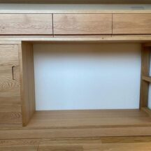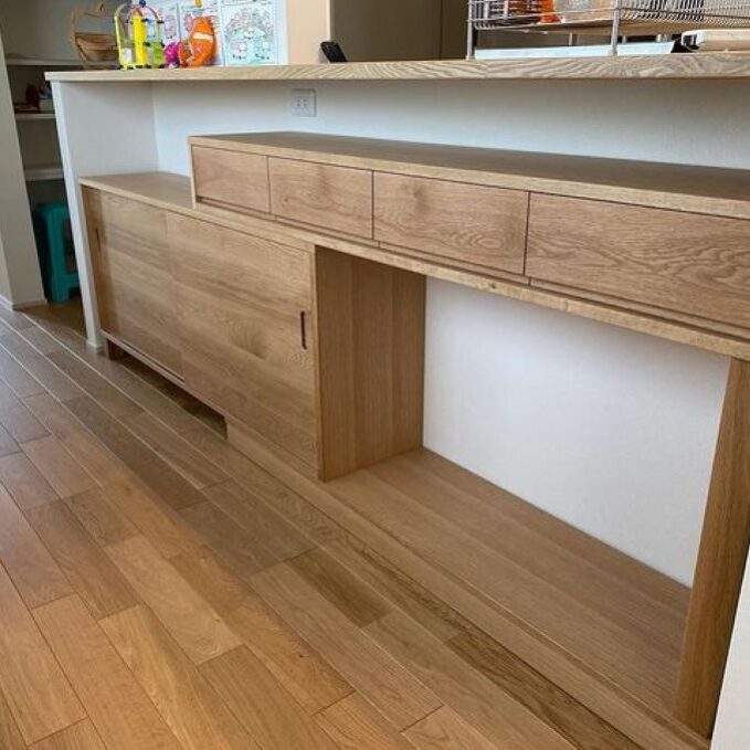 ナラ材で作ったカウンター下収納を納めました。四杯の引き出しと大きな引き戸は、お客様ご自身で入れるものを考えてカスタマイズ。伸縮性がある躯体も、デザイン性を含めた面白さがあります。どこに何を収納して、オープン部分に何を飾るか、いろんな想像が膨らむ家具です。