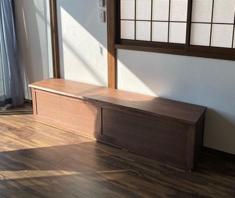 一見シンプルながらも、随所にお客様のこだわりが詰まった壁面収納。置き場所の合わせた内寸、使いやすいスライドテーブル、通気性と見た目を兼ね備えた格子扉等、一つ一つお客様と相談しながら出来上がった家具です。